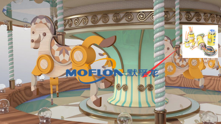 以安装一部简易的旋转木马为例,默孚龙科技设计时在其中心轴上使用五道滑环及碳刷,其中三道接三相电机,两道接220V照明。其中滑环在其中起到传输电流和避免线路缠绕的关键作用,大大的增加了旋转木马的使用寿命。